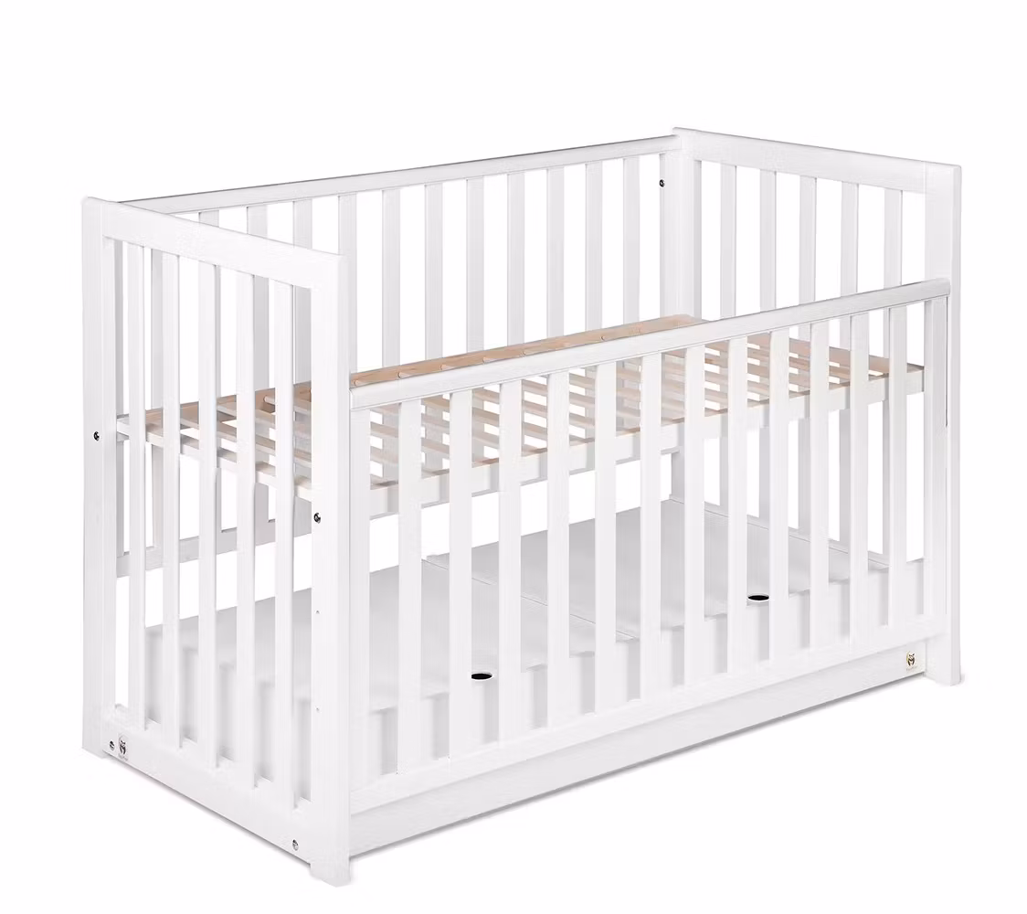 Sidokanten kan fällas ned med en hand, och det går även att ta bort denna sida helt för att göra spjälsängen mer bekväm att använda.