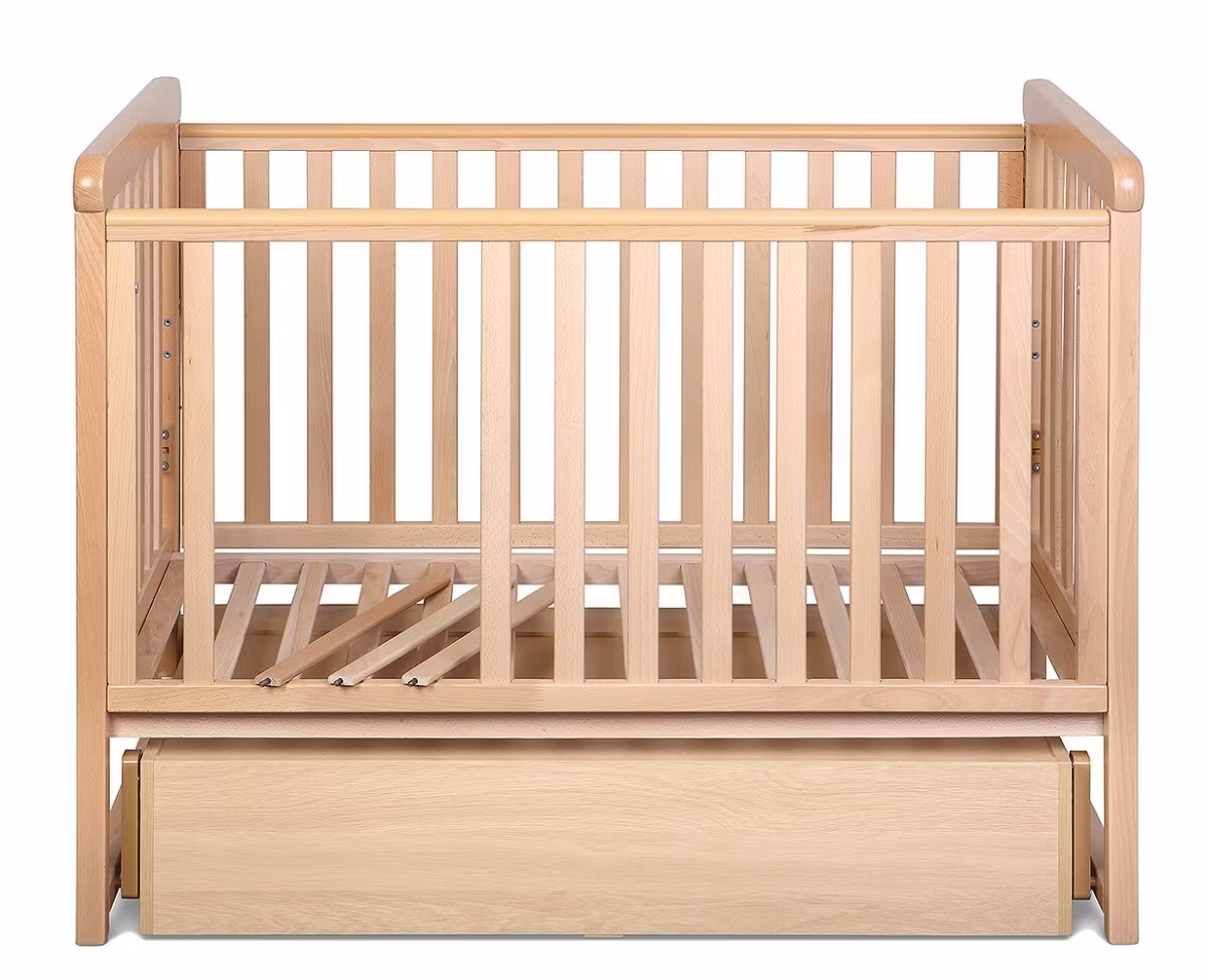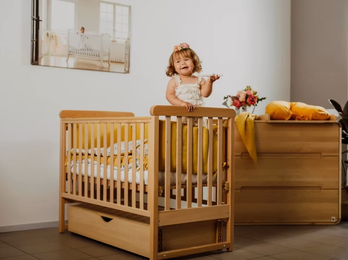 Sidokanten kan fällas ned med en hand, och det går även att ta bort denna sida helt för att göra spjälsängen mer bekväm att använda.