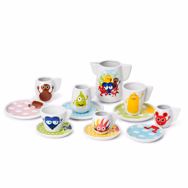Duka upp till kalas med Babblarna! I denna färgglada leksaksservis av porslin ingår sex koppar, sex fat och en kanna. Varje kopp har formen efter den figur som finns på koppen. Vad bjuder du på idag? Saft, kaffe eller kanske varm choklad? När barn babblar, pratar, sjunger och leker tillsammans med Babblarna, utvecklar de samtidigt sitt eget tal och språk. Babblarnas leksaksservis tål maskindisk. Kalaset blir komplett med den matchande Babblarna-tårtan i trä.