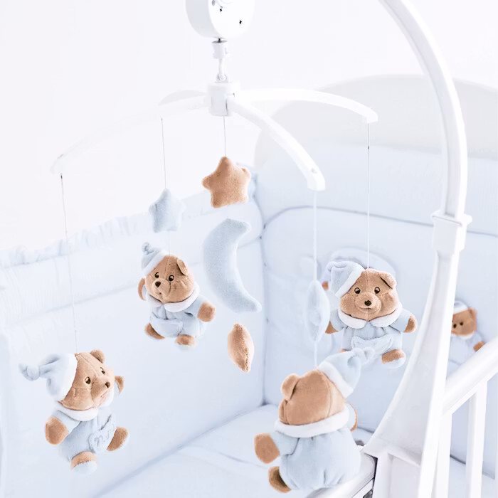 The carousel is equipped with four soft teddy bears in soft chenille of cotton to create a musical carousel, stimulating the first perceptions of the child.
