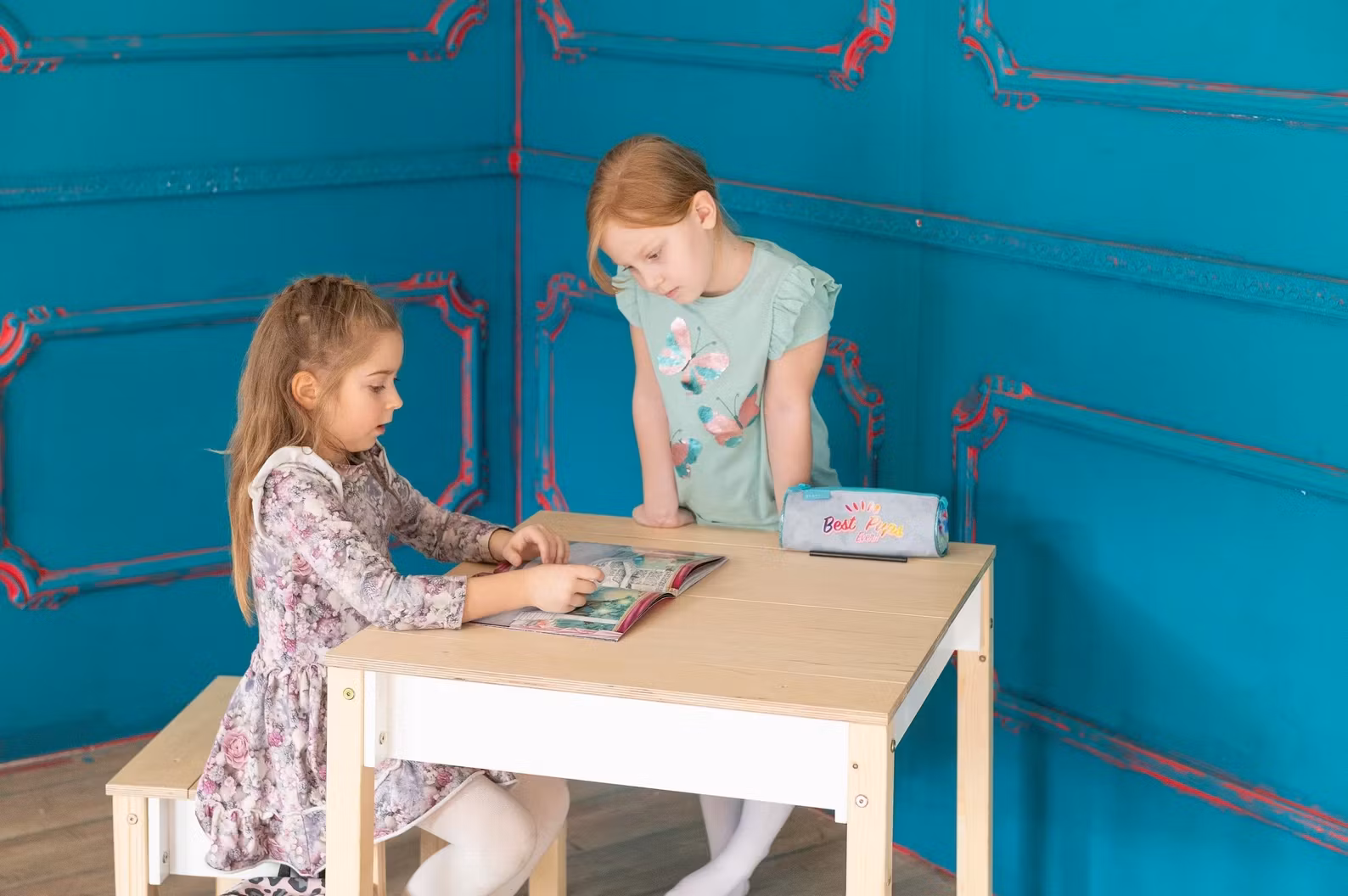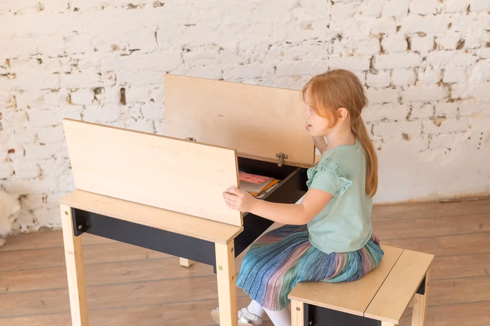 Lyft ditt barns inlärningsutrymme med vårt smarta utrymmesbesparande bords- och stolset, designat för att förbättra deras pedagogiska resa och samtidigt tillhandahålla praktiska förvaringslösningar.
