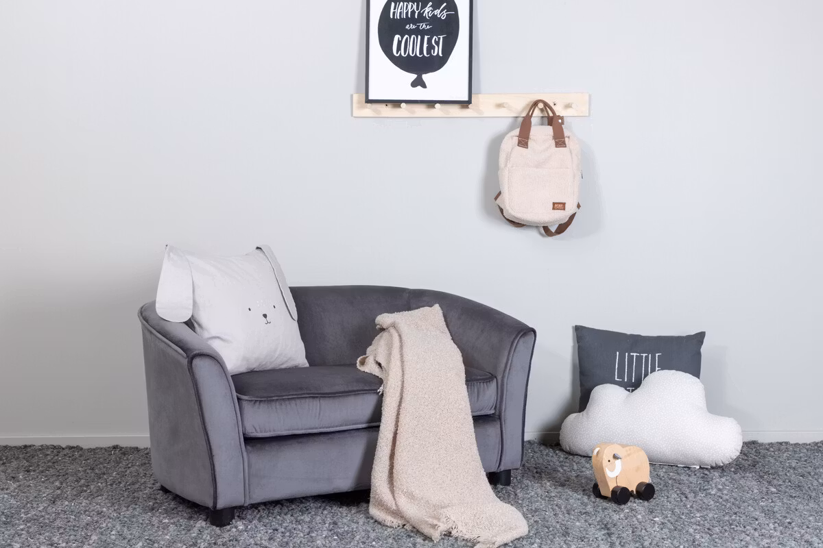 Inred barnrummet med vår mjuka och mysiga soffa Måna. Soffan är tillverkad i ett mörkgrått sammetstyg och svarta ben i plast. Soffans mått: Sittbredd: 72cm, Sittdjup: 44cm, Sitthöjd: 33cm.