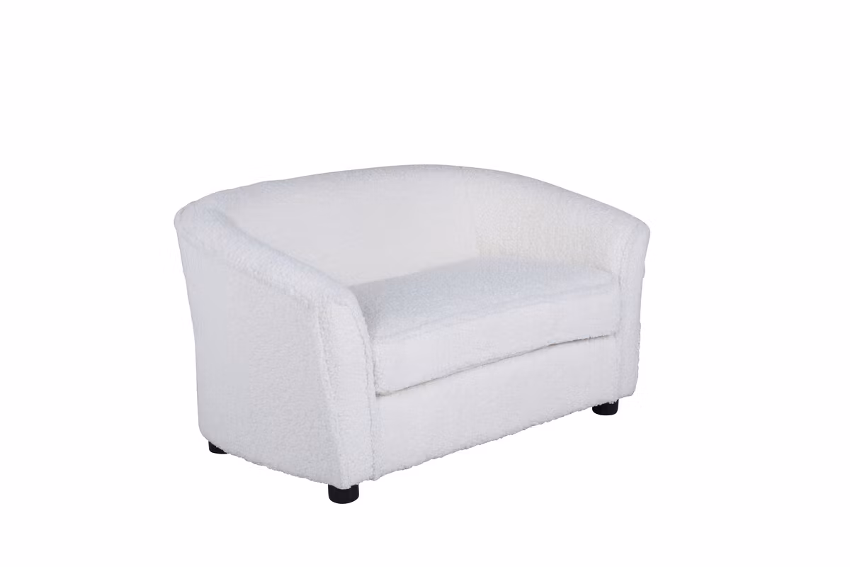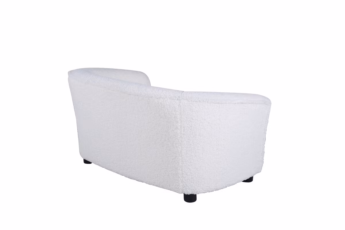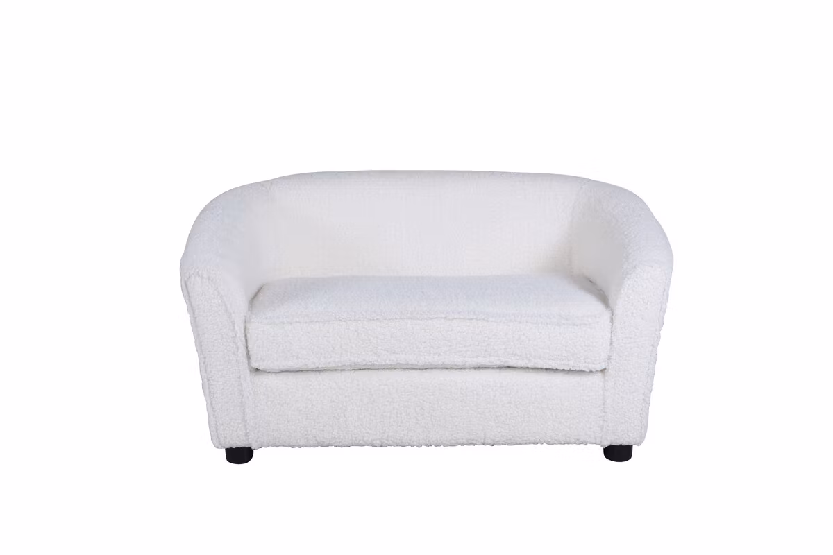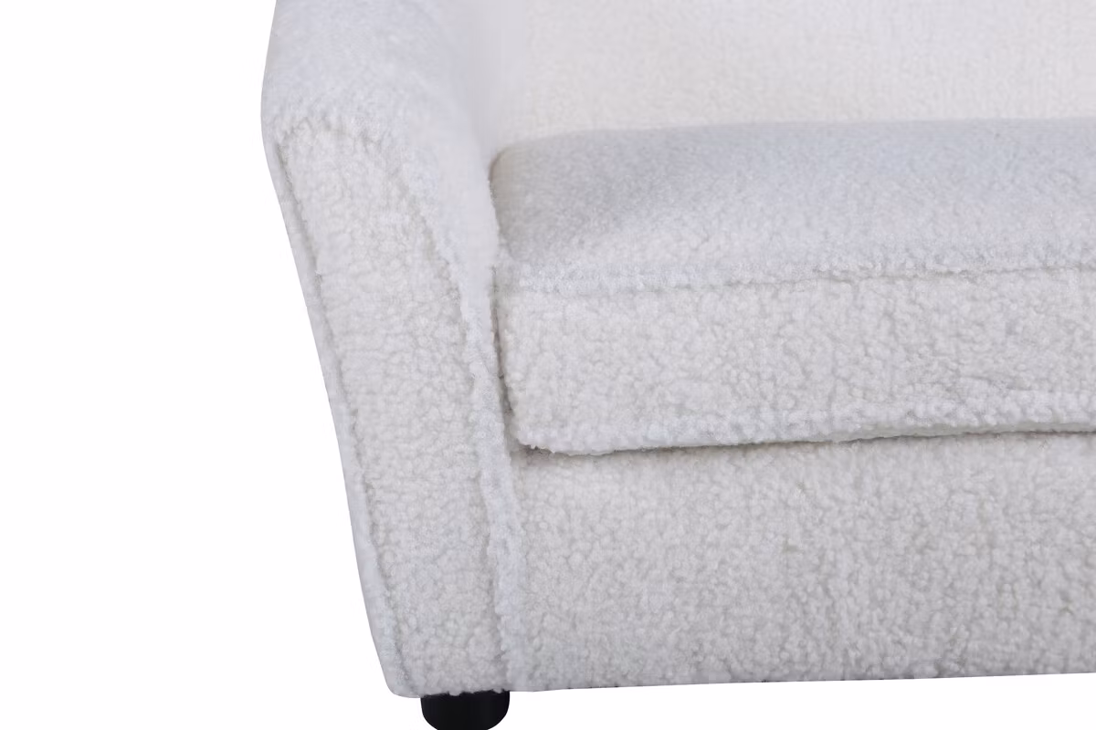 Inred barnrummet med vår mjuka och mysiga soffa Måna. Soffan är tillverkad i ett vitt teddytyg och svarta ben i plast. Soffans mått: Sittbredd: 72cm, Sittdjup: 44cm, Sitthöjd: 33cm.