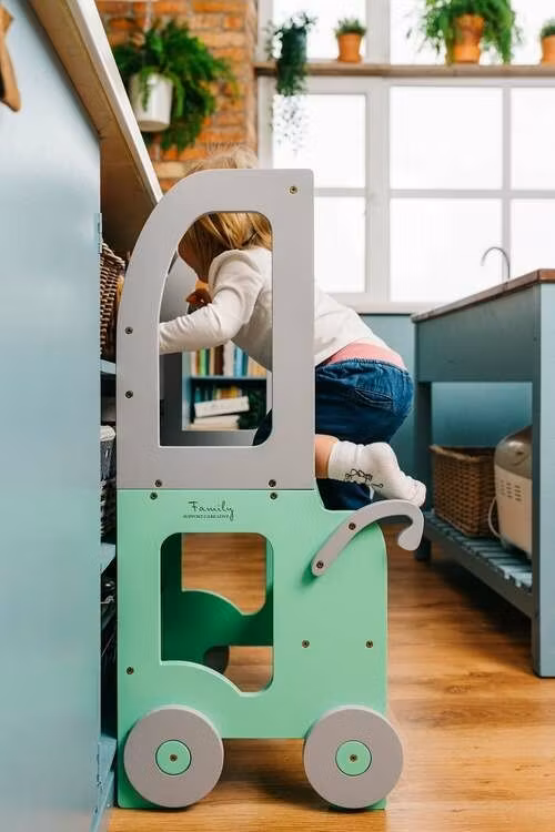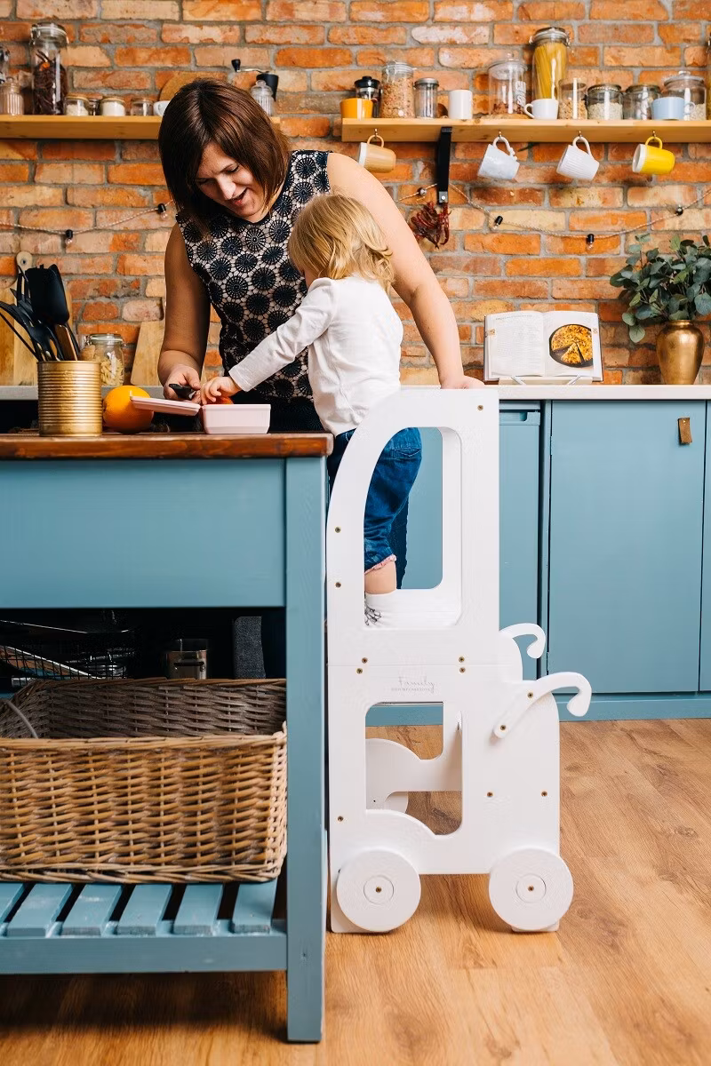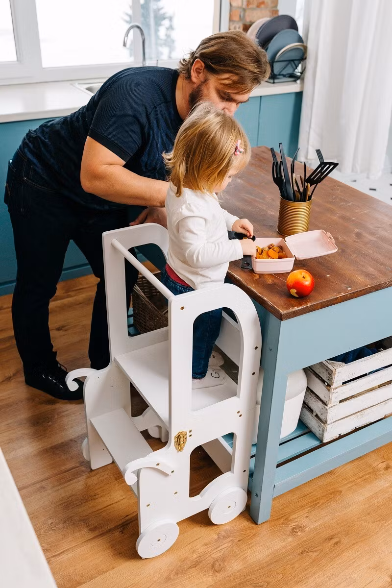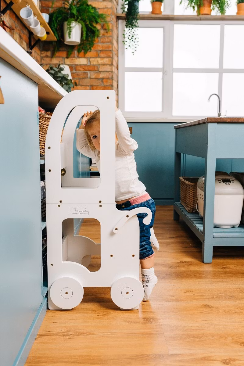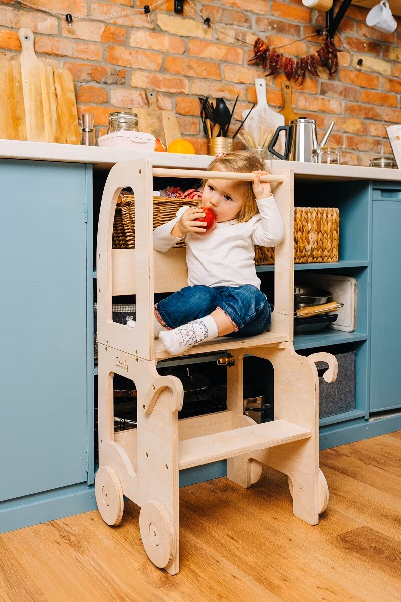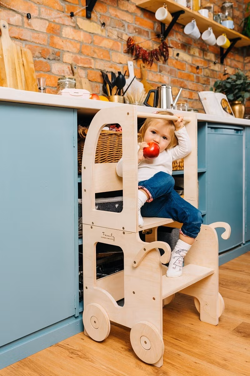 Montessori kitchen step stool which can be easily transformed to table and chair is designed and created for cooking, learning, climbing, sitting next to the large family table and eating or just playing. And what is the most excitatory that this kitchen step stool looks like a toy and it can become as a friend for your child.