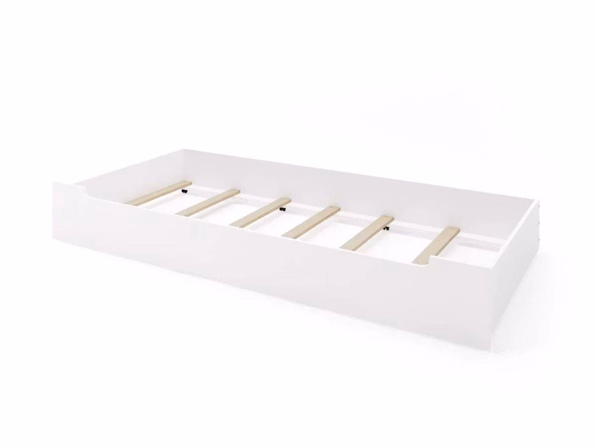 Låda på hjul som kan användas för förvaring eller som extrasäng. Botten och ergonomiska lameller till madrassen ingår.