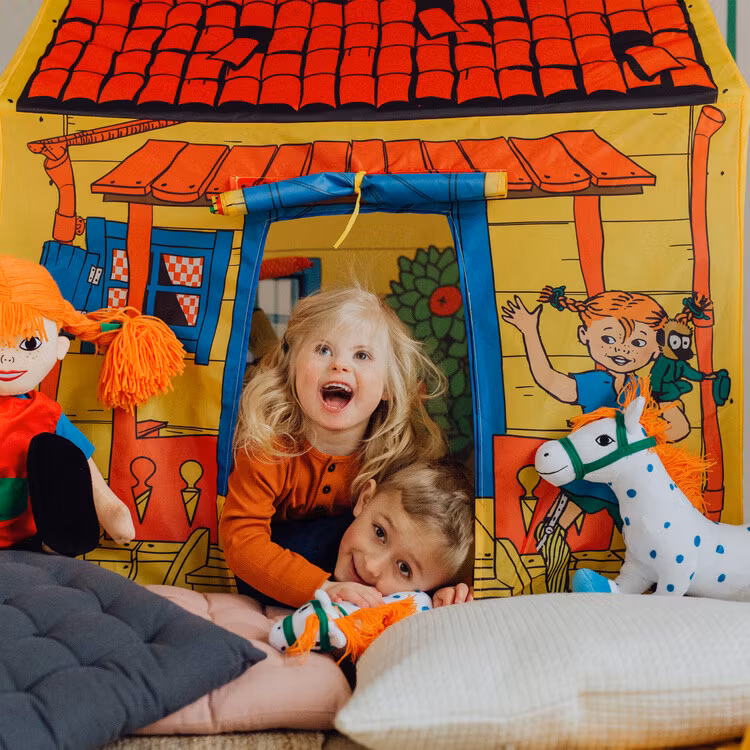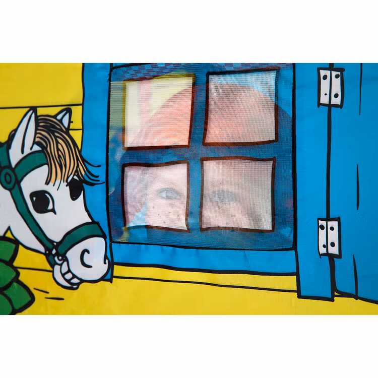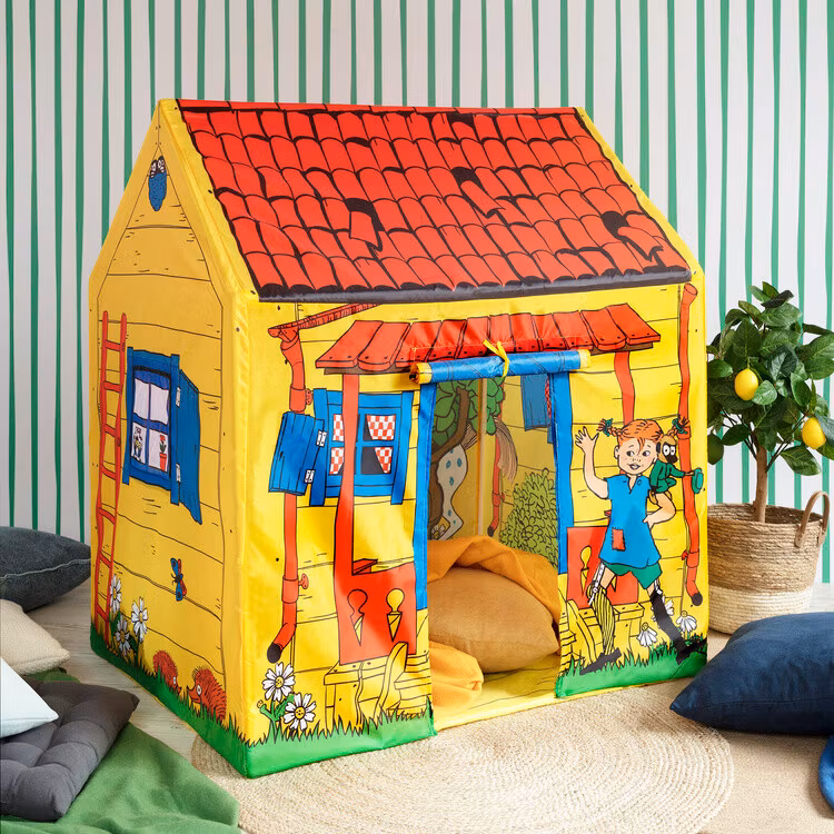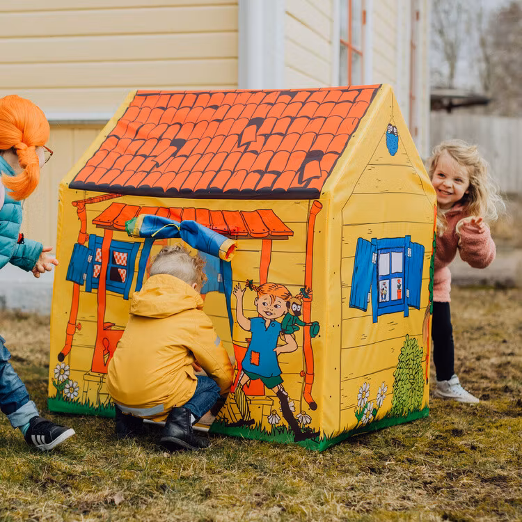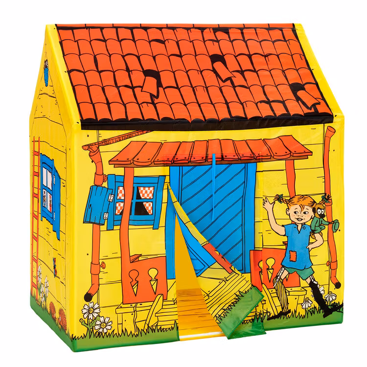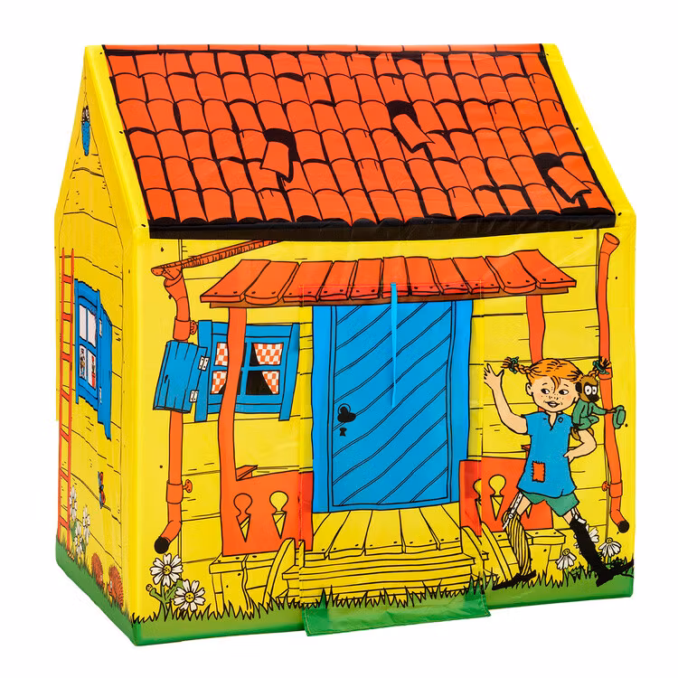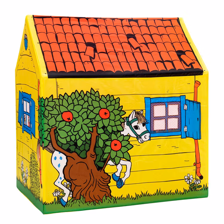 Ett klassiskt lekhus i tyg för alla busiga barn! Lek tokiga Pippi-lekar eller plocka fram favoritsagan och mys en stund i det lilla huset! Gå in och ut genom tygdörren eller rulla upp den och fäst med banden om du vill ha dörren helt öppen. Du kan också rulla upp gardinerna i de tre fönstren. Lekhuset har även ett golv av tyg. Villa Villekulla som lektält gör succé både i barnrummet och i trädgården - kanske ett gömställe när du leker kurragömma? Pippitältet är enkelt att sätta upp och ta ned.