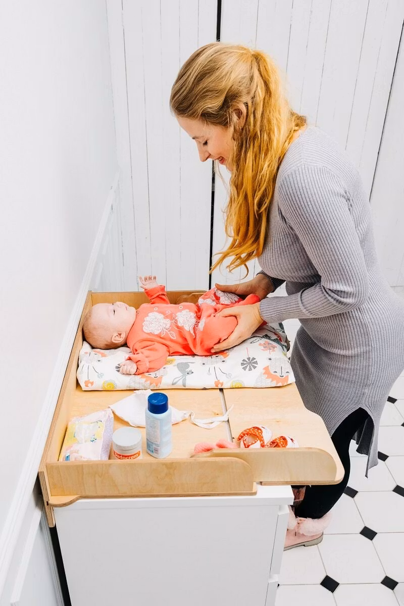 ? Tillräckligt stor - skötbordsskivan är cirka 79 cm bred, så det kommer att finnas tillräckligt med plats för att byta bebis och för att förvara pampers, babykräm, handduk eller andra nödvändiga saker;